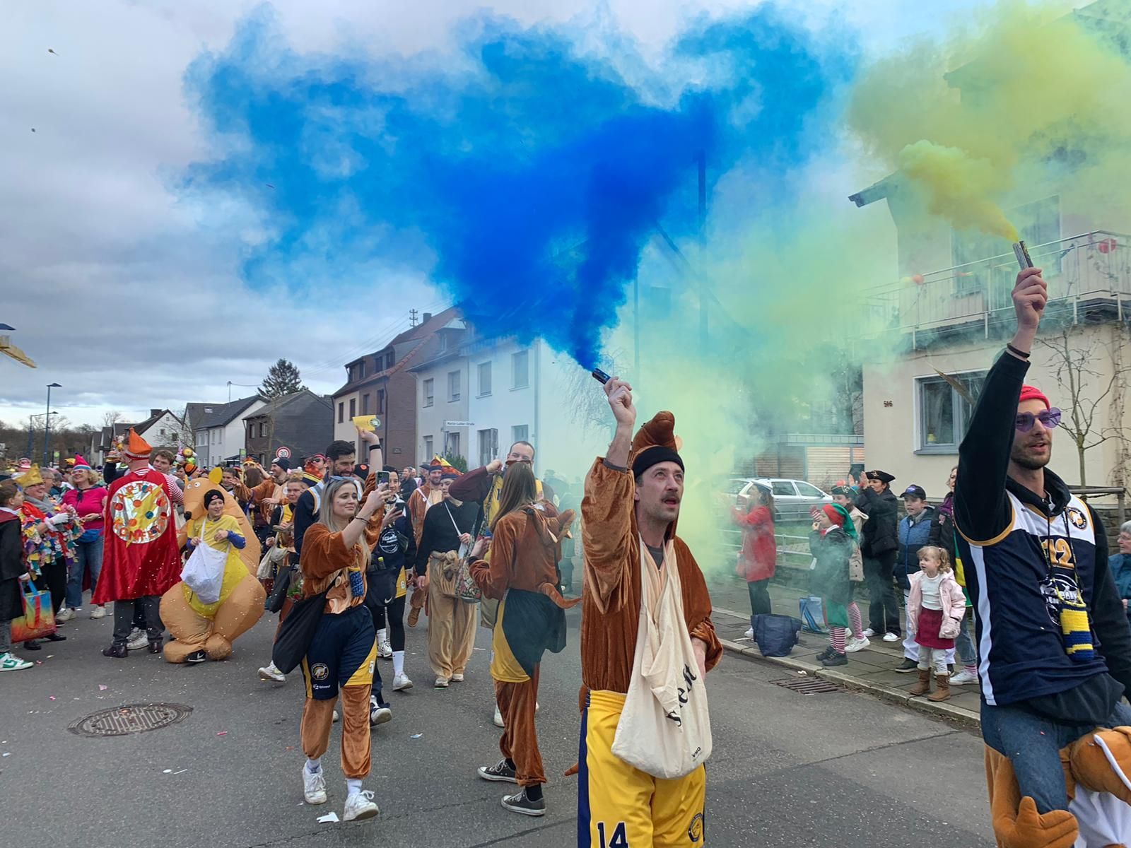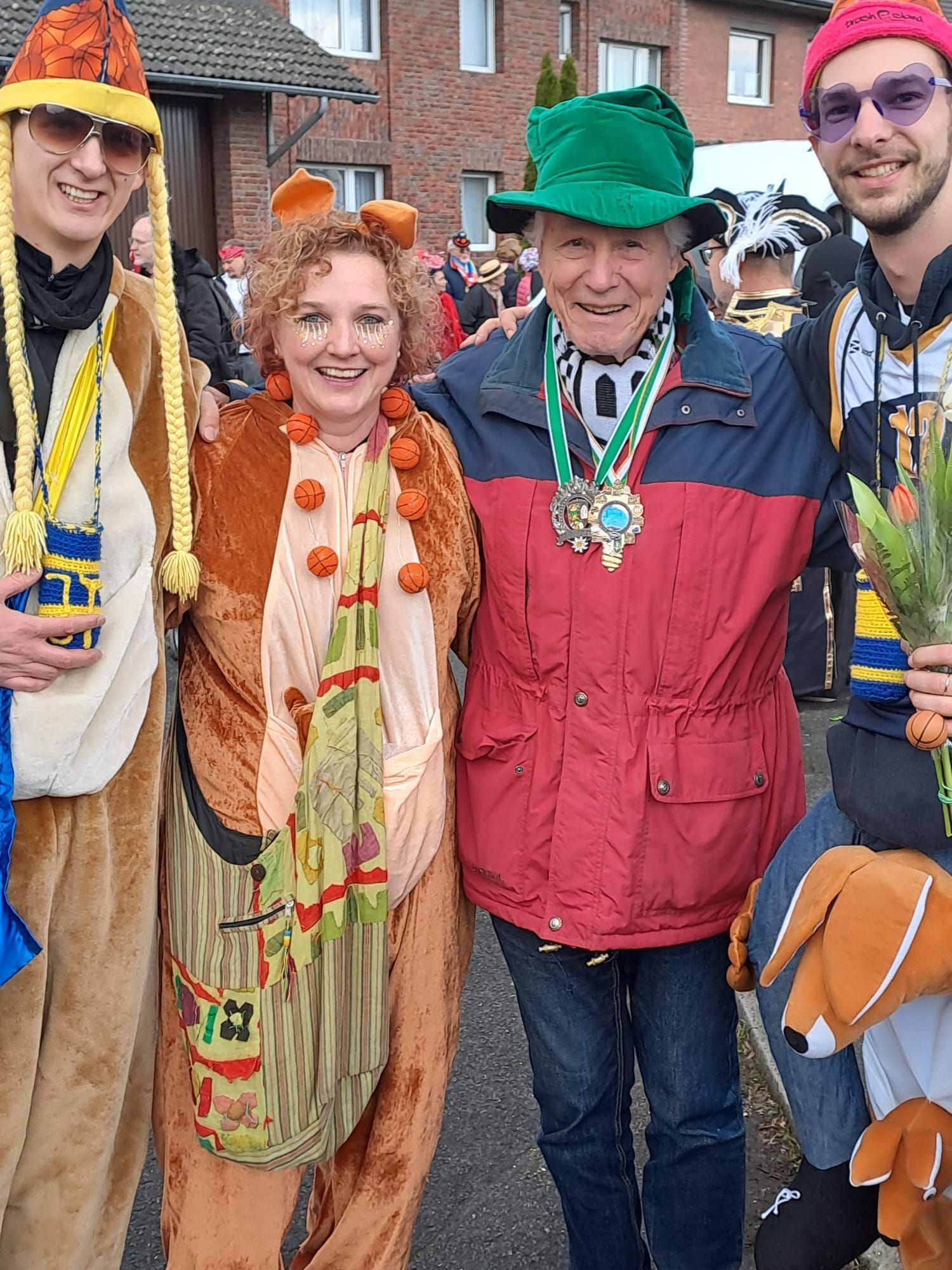 An der Zugstrecke standen ebenfalls einige Hürther Vereinsmitglieder mit ihren Familien, denen Prinz Tobi und sein Gefolge immer wieder HBC-Gesänge widmeten, sodass sich über den gesamten Weg hin das #wearefamily-Feeling verteilte. „Es ist schön zu sehen, dass so viele Menschen mitmachen und sich für den Verein und den Basketballsport begeistern”, meinte der 2. Vorsitzende, Rainer Overmann. Über persönliche Begrüßungen, Strüßjer und Kamelle freute sich neben Dieter van Loo, Rainer Overmann, Kindern aus den Jugendteams oder Spielern und Spielerinnen aus den Seniorenmannschaften, mit Kurt Schürmann auch der Ehrenvorsitzende des HBC. Der langjährige 1. Vorsitzende ließ es sich nicht nehmen, dem jecken Treiben beizuwohnen und vor allem den HBClern zuzujubeln.