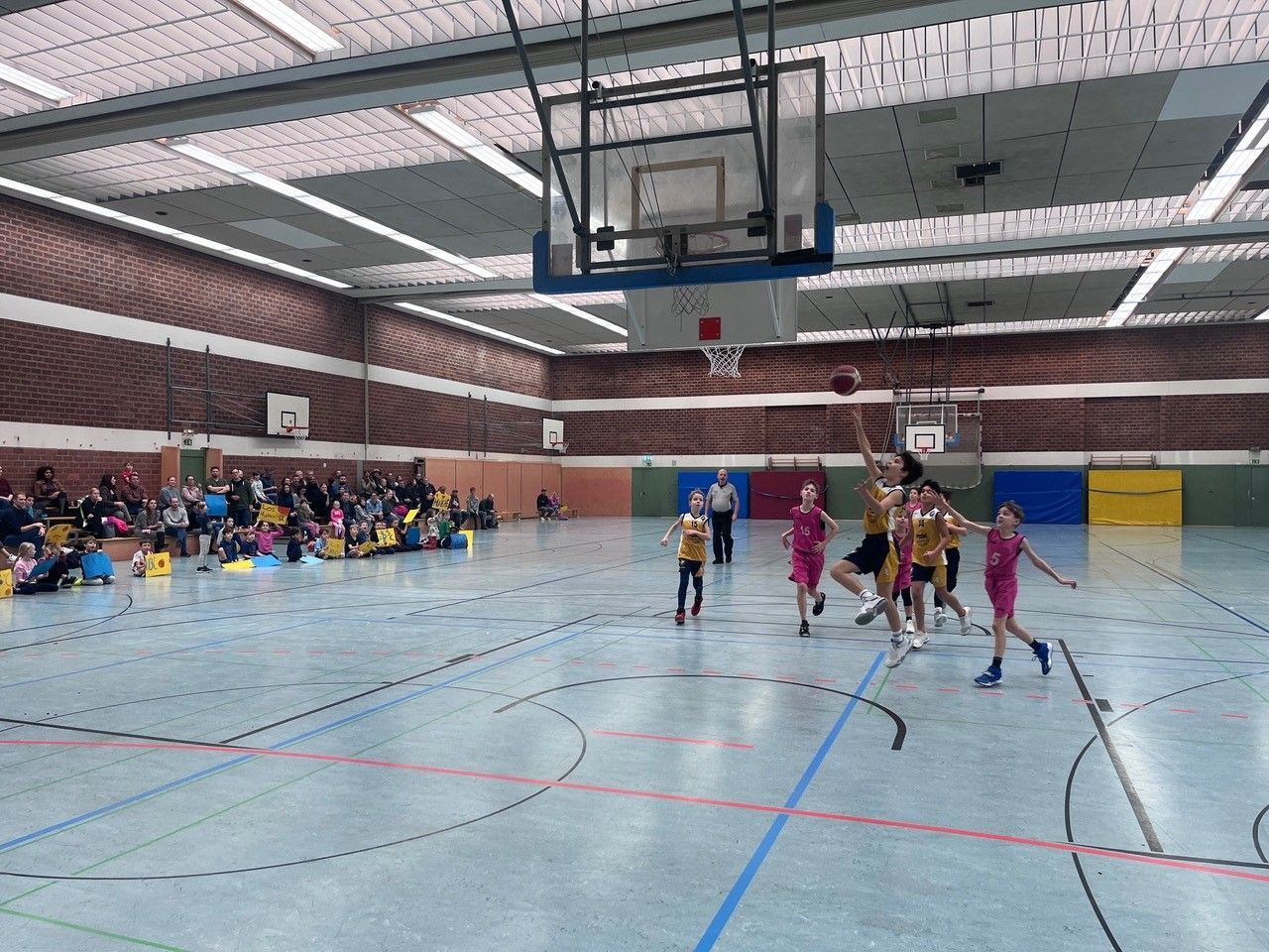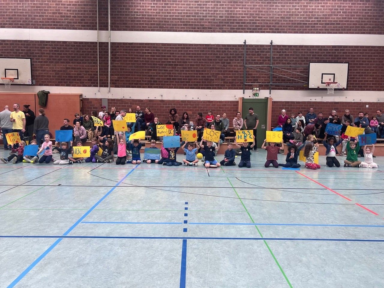 Mit viel Einsatz und Begeisterung legten die U8 Kids zuerst das Basketballabzeichen in Bronze ab, bevor sie sich an einem Weckmann der Bäckerei Klein laben konnten. Anschliessend bereiteten sie mit viel Fantasie und Ehrgeiz an einem eigens aufgebauten Basteltisch jede Menge HBC-Anfeuerplakate in Blau-Gelb-Glitzer für das im Anschluss um 12 Uhr stattfindende Landesliga-Spiel des U10.1 Teams vor. Erstmals konnten die eigens vom HBC angeschafften niedriger aufgehängten Korbbretter genutzt werden, und weit über 100 Kinder und Eltern erlebten ein tolles Spiel mit viel Einsatz und gelungenen Aktionen, das die HBC-Kids hochverdient mit 87:51 für sich entscheiden konnten - nicht zuletzt wegen des unermüdlichen Anfeuerns aus allen Kehlen des U8 Teams.